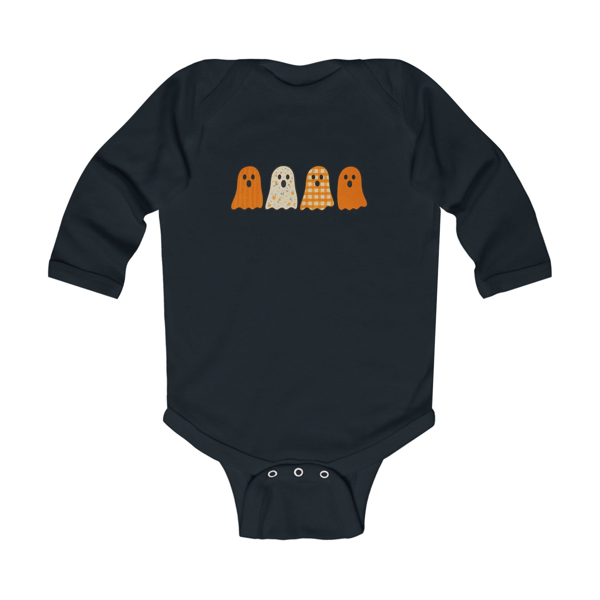 Keep your little one cozy and festive with the Kids Four Ghosts Long Sleeve. Featuring four playful ghosts—solid orange, floral print, gingham check, and bright orange—this shirt brings the perfect mix of fun and spooky for Halloween season. The long sleeves keep them warm on chilly fall days, while the soft fabric ensures all-day comfort whether it's at cuddled up on the couch, at the pumpkin patch, or trick-or-treating.