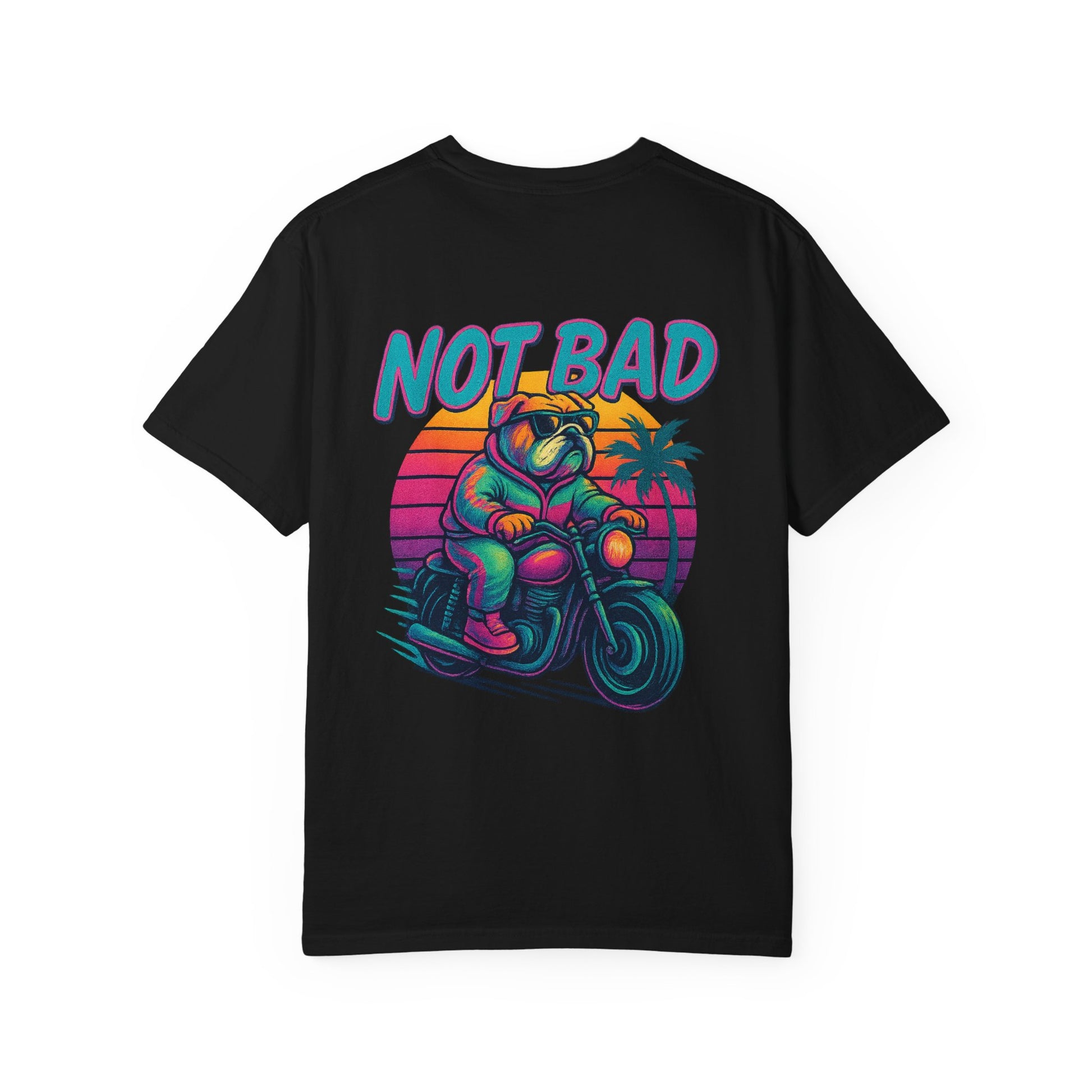 Featuring a jacked-up bulldog in a tracksuit riding through a neon sunset, this shirt screams 80s heatwave rebellion. With vibrant colors, vintage Miami Vice vibes and attitude for days.